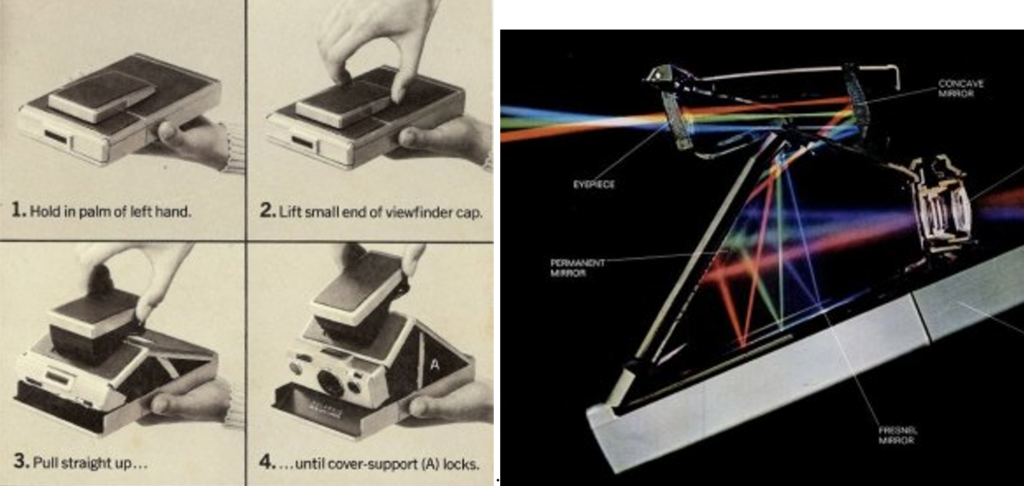 The SX-70 camera was as magical as the film. Remember, there was no enlargement, so the camera had to be as big as the print, but small enough to carry around easily. The SX-70 camera was folding single lens reflex (SLR) with an ingenious optical path featuring off-axis aspherical optics, totally unheard-of at that time. The camera design won it a place in the Museum of Modern Art.