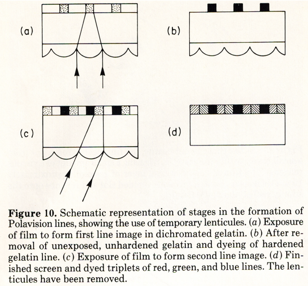 Unlike normal color photography (including Polaroid), Polavision did not use subtractive dyes (magenta, cyan, yellow) but instead used additive colors – red, green, and blue, like in color television. The film had alternating fine stripes of red, green, and blue filters – 1500 triplets per inch – overlaying a black-and-white positive transparency. Just making the film was a tour de force. As seen in the diagram below, tiny cylindrical lenses called lenticules coated on clear plastic film were used to focus light of one color onto a layer of colored gelatin, hardening it to form a set of filters on the film. The lenticules were then washed away and the process repeated for each of the other two colors, then the light-sensitive silver halide layer added. All of this was done continuously at high speed on the so-called Land Line in Norwood.