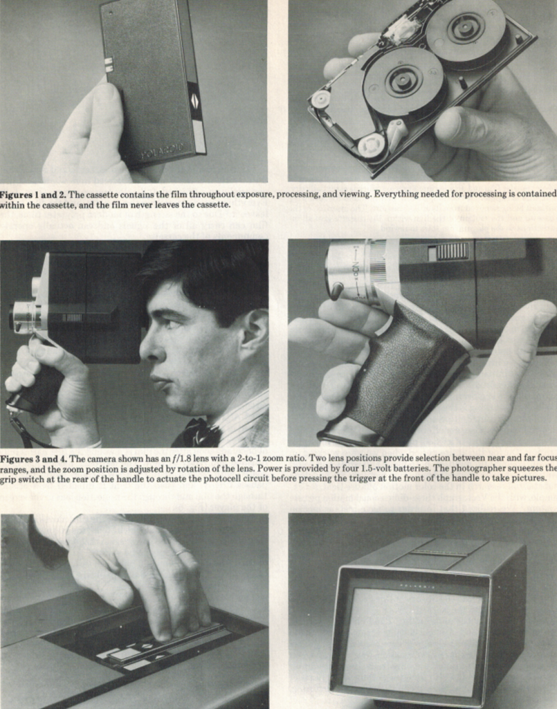 The film was sealed inside a cassette. After exposure, it would be inserted into a slot in the player, which looked a bit like a small television set with a rear projection screen. Upon insertion, rewinding the film unsealed the developer, which was wiped over the rewinding film. A few seconds after rewinding, the film began projecting in the player. Like other Polaroid products, the whole thing was designed for simplicity and ease of use.