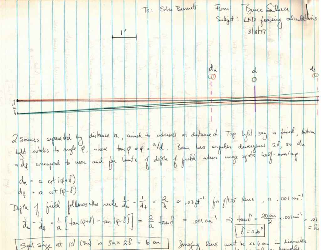 Here is one that I found in my files. I don’t even remember it. The question was whether light emitting diodes (LEDs), which were new at that time, were bright enough to be used for focusing the movie camera at a distance of 10 feet. It was some optics calculations, as you see here. My conclusion was the brightness was marginal at that distance. Note that the report was in longhand, as was typical back then. This was before word processors, before PCs. Normally handwritten reports would be typed up by secretaries, but with all the Greek symbols here that wasn’t an option.