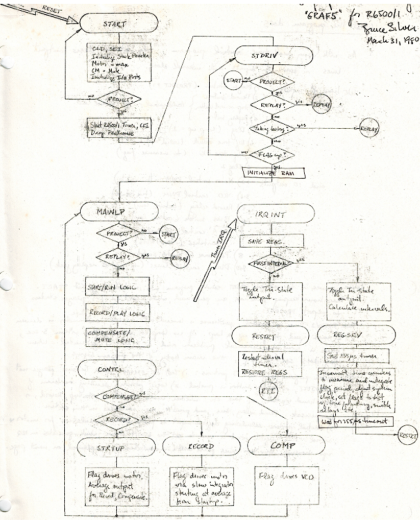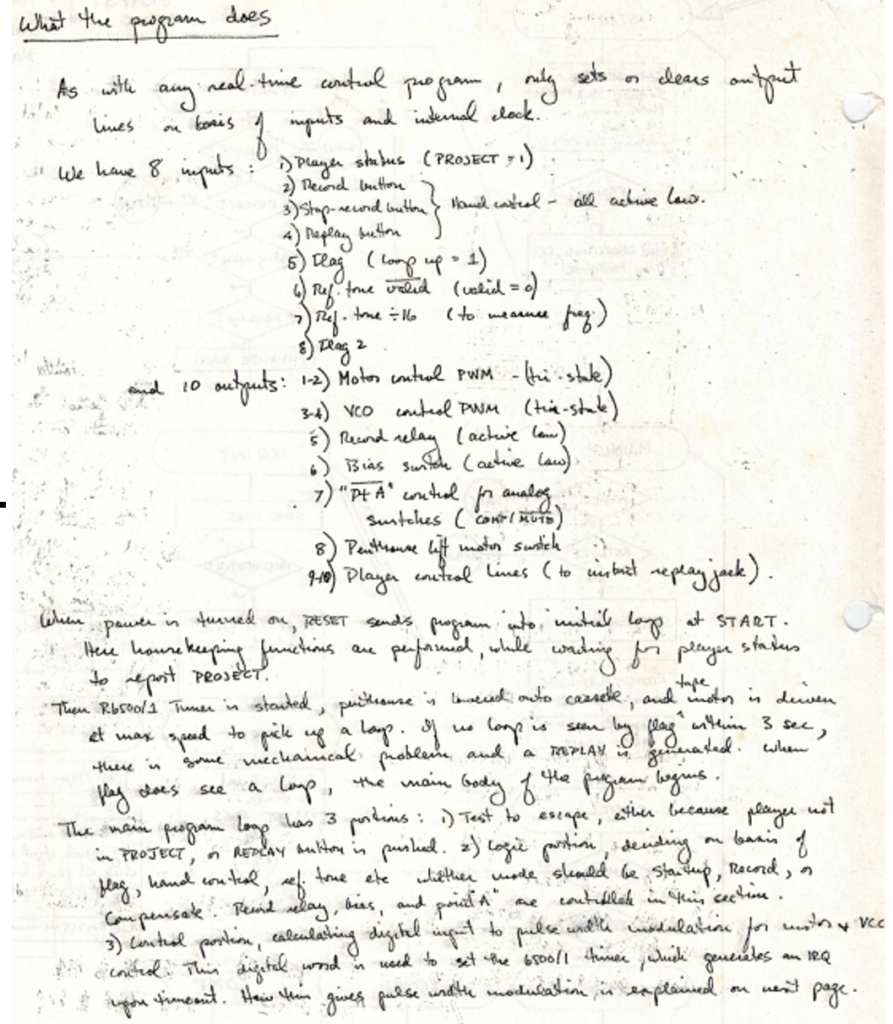 This time we went digital. In 1978, microprocessors were brand new, but that became my part of the effort. We used a Rockwell 6500/1, a single-chip microcomputer based on the processor used in the Apple I. I programmed it in assembler – machine language, basically – to perform all control functions for recording and playback. Did I know anything about computers or programming? Of course not! But physicists just figure it out… The system diagram and first page of documentation are shown above. Looking back on it now, I’m actually pretty impressed.