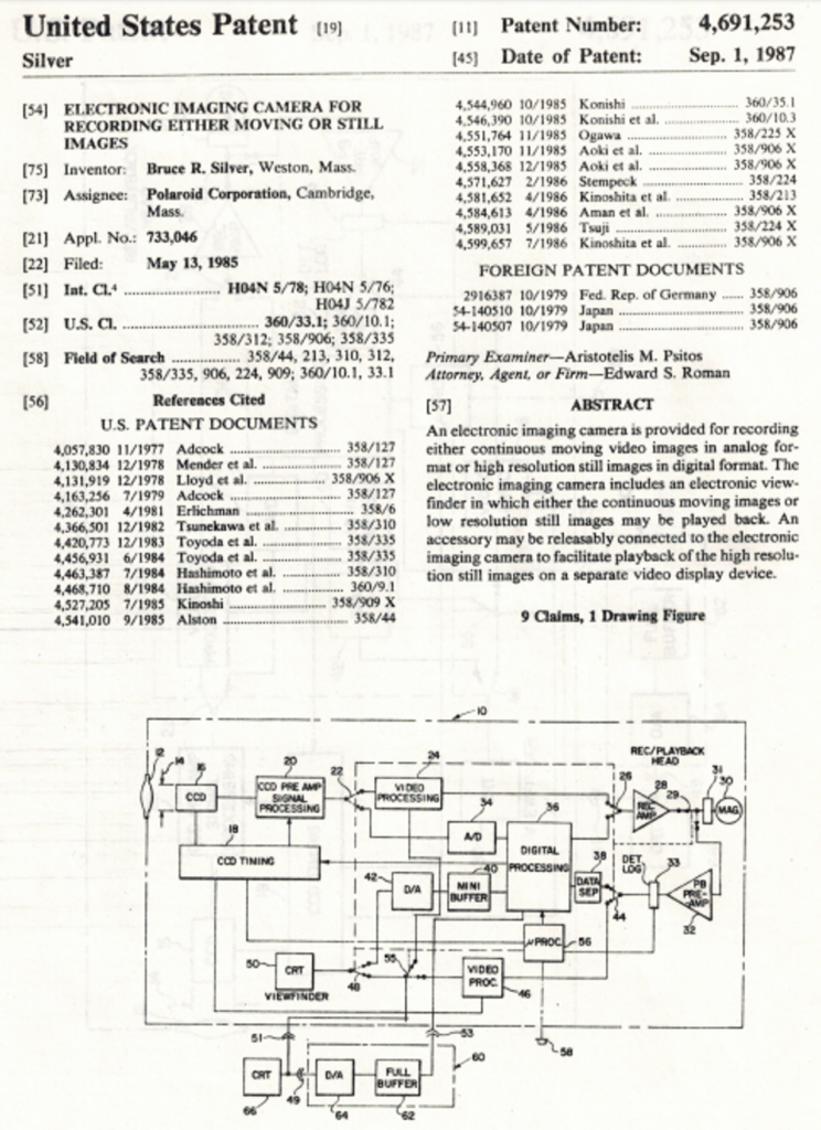 A better way to solve that problem would be a special CCD chip with two sections viewing the same scene, a high-resolution section that would be read out slowly into high-capacity storage and a low-resolution section driving a video viewfinder. We didn’t have such a chip, but I filed a patent on it anyway in 1985, and it was awarded in 1987. I had previously gotten a patent on something very simple, a method of communicating button pushes on the Polavision camera. That one was stupid, but I was proud of the new one.