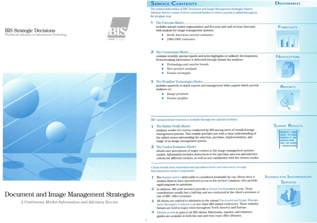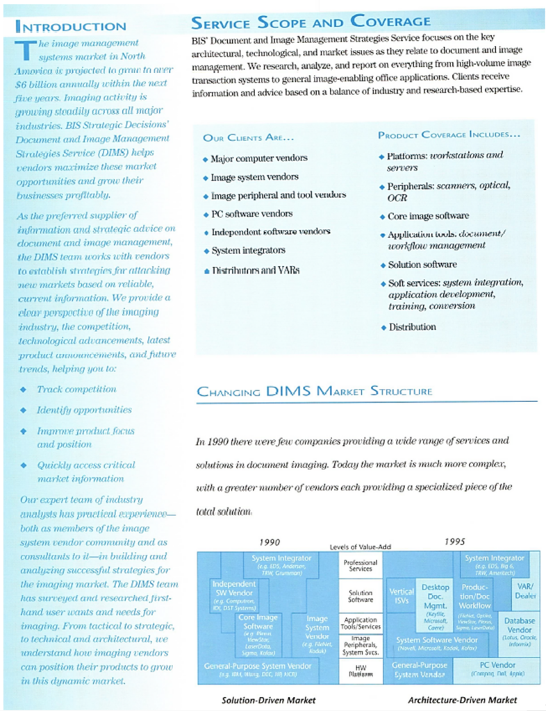 I was recruited by Rai Wasner, senior VP in charge of the CIS business. My immediate manager, Roger Sullivan, was someone I knew, since he had been the WIIS marketing manager at Wang! Unlike all the other services at BIS, clients of my Document and Image Management Strategies (DIMS) service included both vendors and end users. Roger focused more on the end user business, where the company was a bit of a fish out of water. My focus was more on the vendor business, although I was actually responsible for the whole thing.