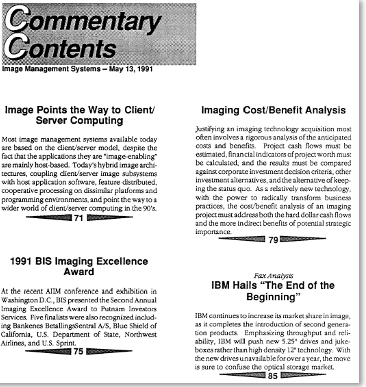 In those days, before the Internet, companies had no easy way of getting information about their products and strategies out to the public. There was a robust trade press, newspapers and magazines like Computerworld and Datamation, which were free to subscribers and contained lots of ads. They provided news but covered all of computing. The CIS filled the role of filtering and summarizing the news in a specific topic like document imaging and offering background info and expert commentary on top of that. When a new product release came out, vendors would have briefings just for the industry analysts, so we could provide more detail than you’d find in the trade press. That was easy money while it lasted; a few years later, free information on the Web would kill the easy part.