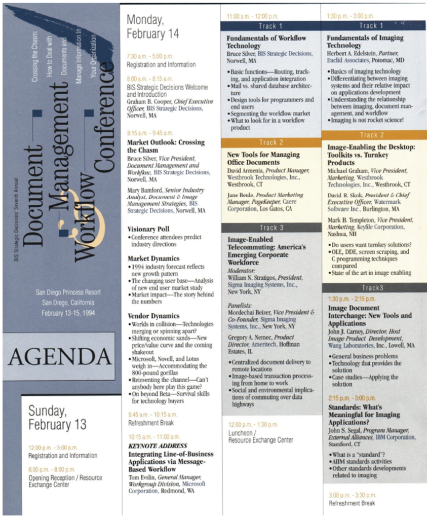 In addition to everything else, our service put on a conference every year for clients at a fancy resort hotel. It was a big money-maker, but it belonged to the conference group. It didn’t go on our P&L. That’s ok because putting on a conference is a huge amount of work. You have to know what you’re doing, and our conference group did. I show here the agenda for our 1994 conference, which by then was called the BIS Document Management and Workflow Conference. Note “imaging” was by then not even in the name.