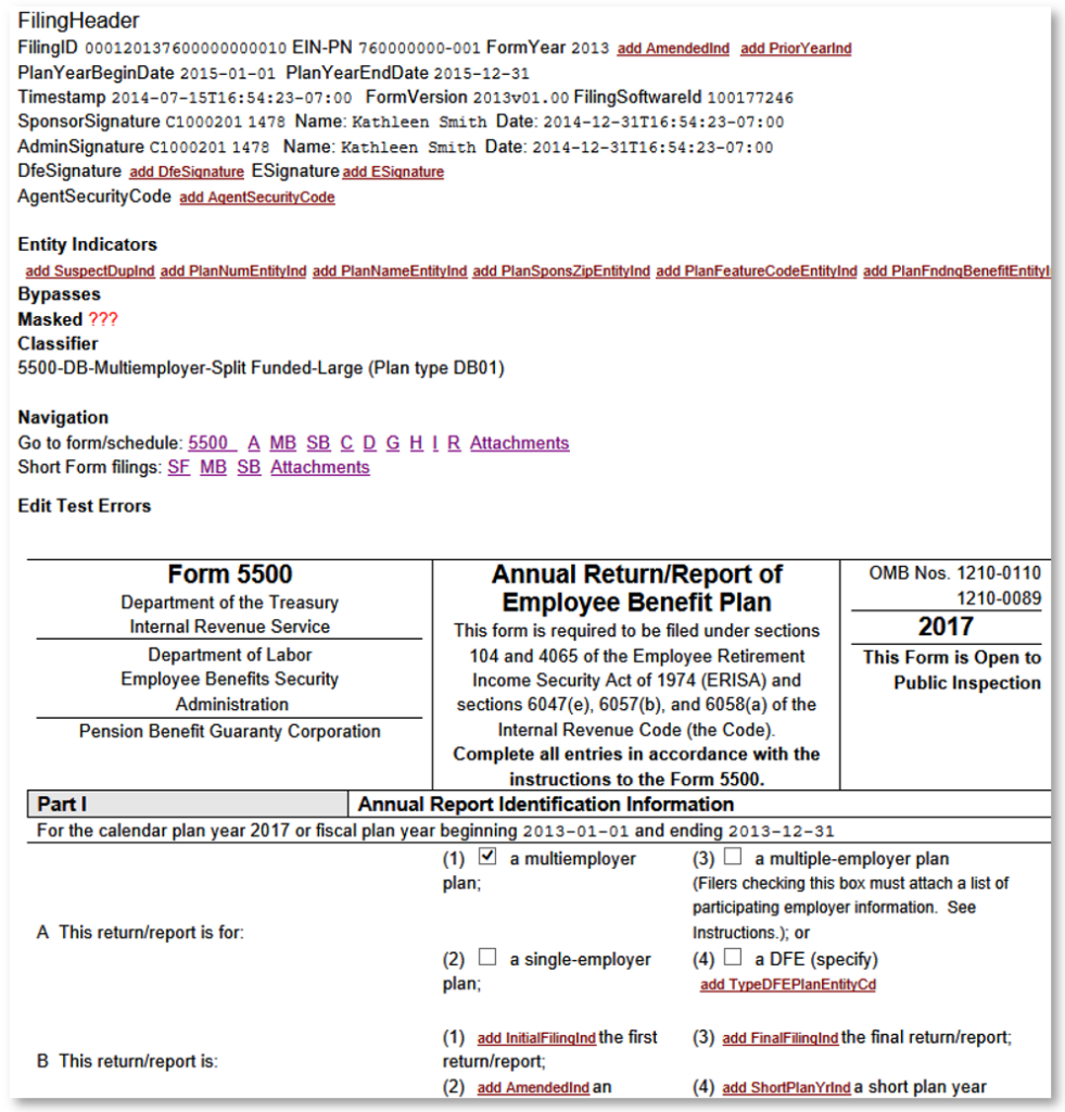 By the time we put together the DER, I was fully XML-savvy. I developed XSLT programs to automate the assembly of the DER, which is over 1000 pages of data element requirements that are updated every year. Not only that, I used another Altova tool called Stylevision to create editable XML forms formatted to look like the printed EFAST2 forms, that validate the entered data against both the rules of the XSD and about 300 edit test rules implemented in XSLT. These rules are used by MPR to check the edit tests and annual form changes. Those rules are the same as the ones implemented by EFAST2 in production. They have to be, since we define them for the contractor. In fact, when a filer submits the filing, the system checks it against those rules in real time and returns a list of errors, if any. In that case the filer must fix and resubmit.