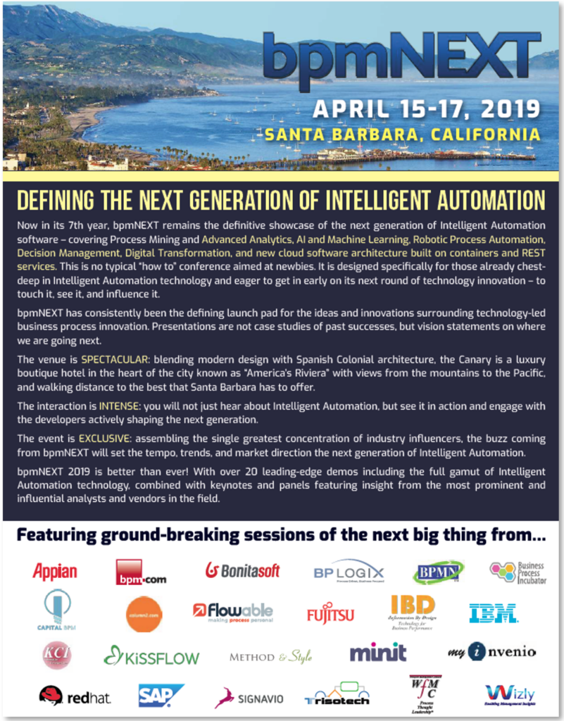 It would be a bit like Think Tank back in 2005, not for newbies and not even for selling at all, but a peer-to-peer event for industry leaders where we would discuss where things were headed, where the technology was going next. I’d call it bpmNEXT. One thing I especially hated about typical BPM conferences were the “case studies,” talks by end user organizations about their experience implementing a solution by Vendor X. These were typically pay-to-play slots purchased by Vendor X as part of their conference sponsorship. Just awful. We would have none of those. In fact, I didn’t want those pie-in-the-sky TED-talk things, either. I wanted to see real working demos, stuff from the labs. I got pretty excited about it – too much wine, maybe? – but Connie Moore of Forrester (she had taken my place at BIS Strategic Decisions when I left in 1994) dissed the idea as “boys and their toys.” Well, whatever. After the event, Nathaniel Palmer said he liked the idea and wanted to partner with me in making bpmNEXT a real thing.